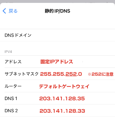 3.静的IP/DNS設定をタップして、固定IPアドレスとDNSを入力します。