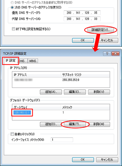 1.IPアドレスを入力する画面下の「詳細設定」をクリックし、IP設定の画面で、ゲートウェイのIPアドレスを選択して「編集」をクリックします。