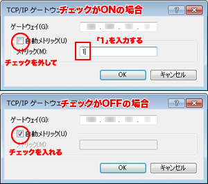 2.下記の通り自動メトリックのチェックがONの場合は、チェックを外して、メトリックに「1」を入力。