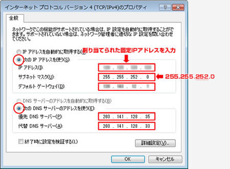 割り当てられた固定IPアドレス(申し込み時のメールをご確認ください) |