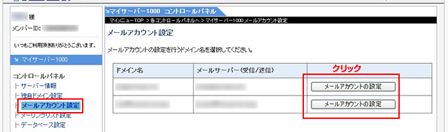 左側の「メールアカウント設定」をクリック変更対象ドメインのボタンをクリックします。