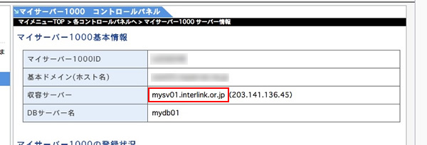.コントロールパネルTOPより収容サーバーを確認します。