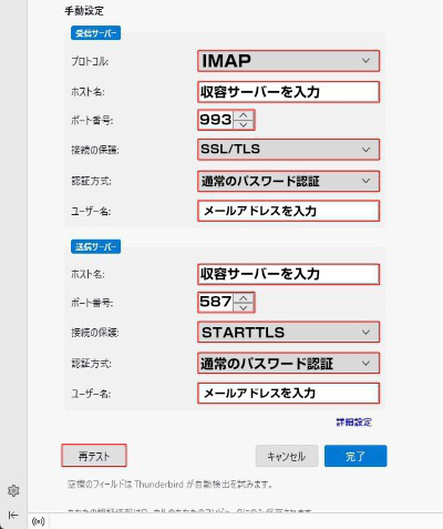 4.次の内容を入力して「再テスト」をクリックます。