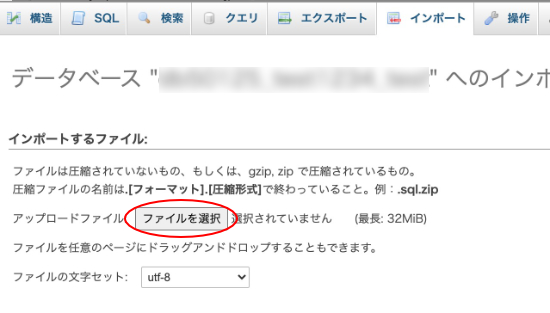 2.インポート先のデータベースが開いたら、『インポート』のタブより、『ファイルを選択』からパソコンに保存してあるデータベースのバックアップファイルを選択します。
