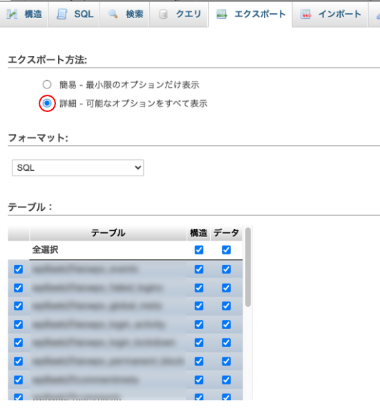 ※詳細にチェックを入れると、エクスポートするテーブルが選択できます。