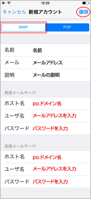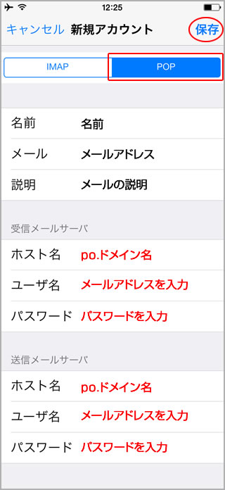 7.POPを選択し、各設定項目を下記のように入力して、画面右上の「保存」をタップします。
