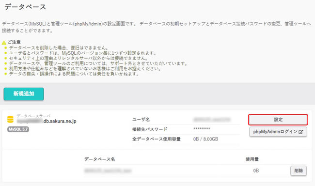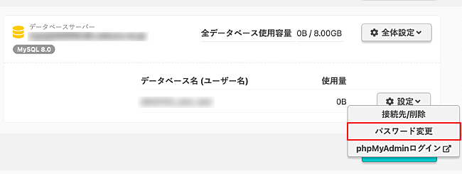 2.再設定するデータベースの右の『設定』をクリックし、『パスワード変更』をクリックします。