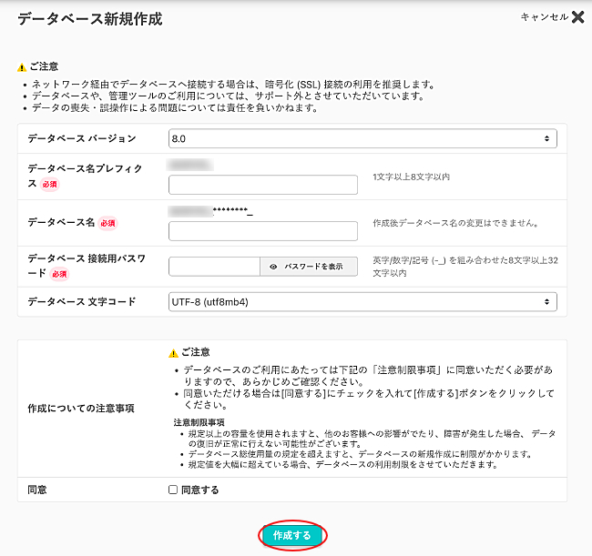 3.作成するデータベースの情報を入力後、『作成する』をクリックします。