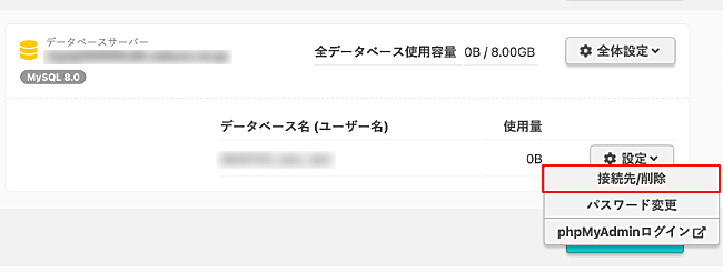 2.該当データベース名の右側の『設定』をクリックし『接続先/削除』をクリックします。