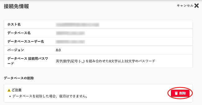 データベースごとの接続先情報の確認と、データベースの削除ができます。