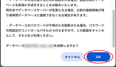 3.データベース名に誤りがないか確認の上『削除』をクリックします。