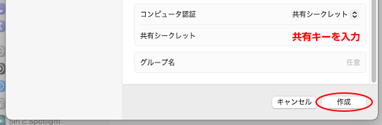 3.下段の画面では種類を「共有シークレット」を入力して、作成をクリックします。