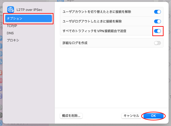 4.作成したVPN設定の右側にある(i)をクリックし、「オプション」メニューより「すべてのトラフィックをVPN接続経由で送信」のチェックを入れます。