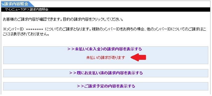 ・「請求内容照会」の「未払い(未入金)の請求内容を表示する」から手続きいただけます。