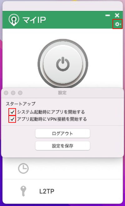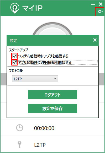設定画面で「システム起動時にアプリを起動する」と「アプリ起動時にVPN接続を開始する」のチェックを入れてください。