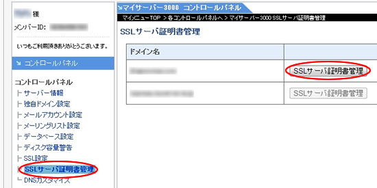 手順1.コントロールパネルにログイン後、左カラムの「SSLサーバー証明書管理」より設定対象ドメイン横のボタンをクリックします。