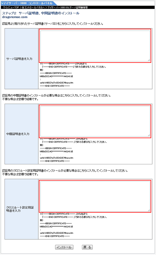 マイサーバーのコントロールパネルでCSRを作成して取得したJPRSサーバー証明書をご利用の場合、仕様によりお客様側で中間証明書(証明書チェーン)の再設定が行えません。 お手数ですが、再設定をご希望の際はこちらまでご連絡ください。 |