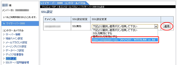手順9.「SSL設定」よりサーバー証明書を選択して「適用」をクリックします。