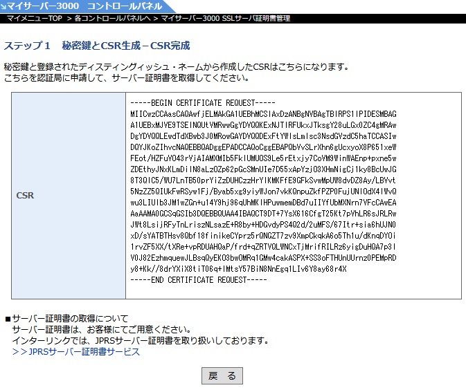 手順5.CSRが発行されます。このCSRを認証局に申請してサーバー証明書を購入してください。