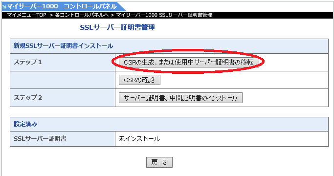 ・他社レンタルサーバーで使用中のサーバー証明書をマイサーバー1000・3000にインストールする場合は「秘密鍵」も一緒にお持ち込みいただき、手順1から始め、手順3では「秘密鍵のインストール」を実施のうえ、手順6へ お進みください。
