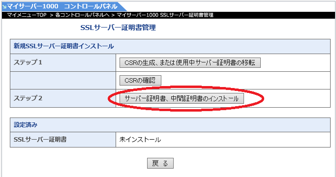 「サーバー証明書、中間証明書のインストール」をクリックし、認証局で購入した、または他社レンタルサーバーで使用していたサーバー証明書をインストールします。
