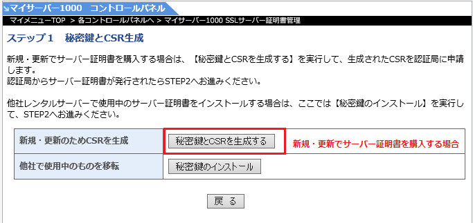 手順3.新規・更新でサーバー証明書を発行(購入)する場合は「秘密鍵とCSRを生成する」を
