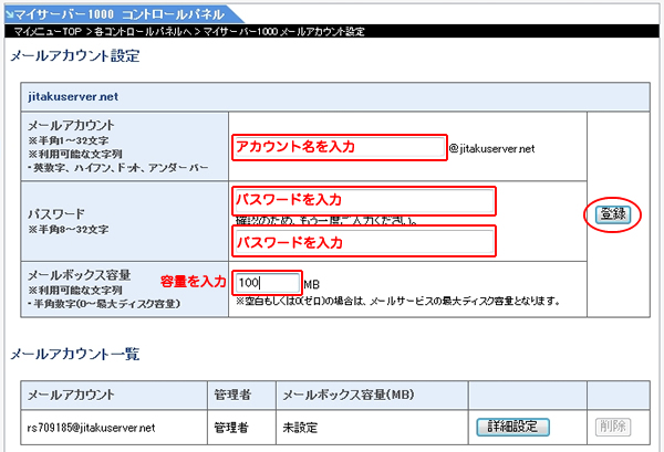 4.アカウント名(@の前の部分)、パスワード(8文字〜32文字)、メールボックス容量を入力して「登録」ボタンをクリックします。