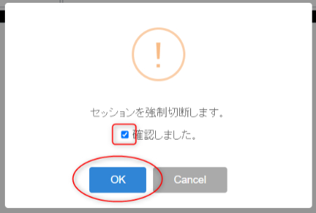 .セッション中の場合、画面上に「強制切断」のボタンが表示されますのでクリックします。