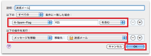 スパムと判定されたメールを全ての迷惑メールフォルダーに振り分ける場合は、「X-Spam-Flag」と入力