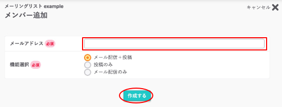 メールアドレスを入力し機能を選択し、『作成する』をクリックします。