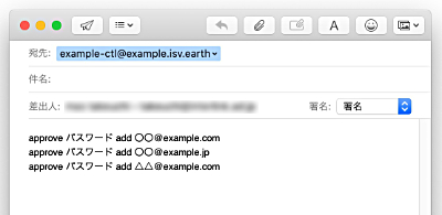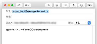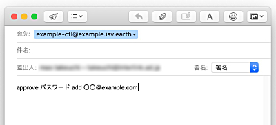 2.『 approve パスワード add 参加者のメールアドレス 』という一文をメールの本文に記述します。なお、件名は不要です。