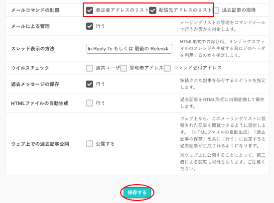メールコマンドの制限項目にある「制限したい項目」にチェックを入れ、『保存する』をクリックします。
