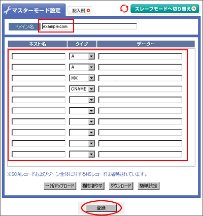 2.ドメイン名、ホスト名、タイプ、データをそれぞれ入力して「登録ボタン」を押して設定完了です。