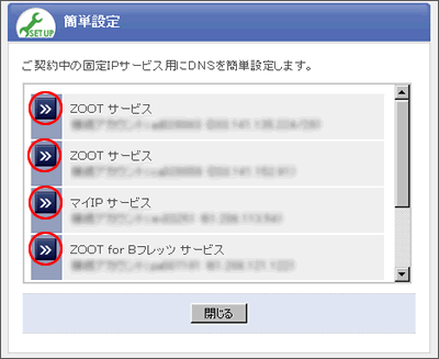 3.現在ログインしているメンバーIDで契約している固定IPアドレスサービスの一覧が表示されます。設定を希望されるサービスを選択します。