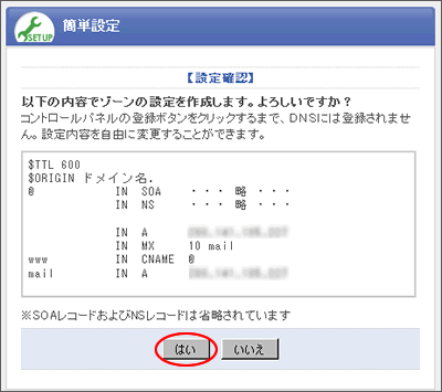 5.設定されるzone情報が表示されますので、「はい」をクリック