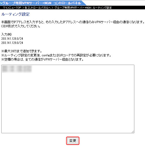 4.ルーティングの設定画面が表示されますので、IPアドレスを入力後「変更」をクリックしてください。