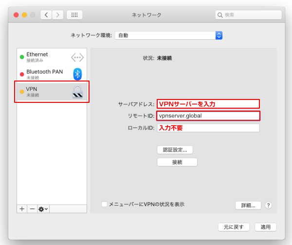 3.インターフェース、VPNタイプ、サービス名入力表示されます。それぞれ下記のように入力して「作成」ボタンをクリックします。