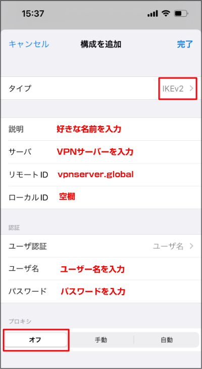 5.タイプが「IKEv2」になっている事を確認し、下記のようにVPN接続情報を入力します。