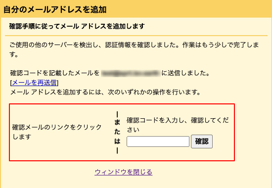 ウェブメールもしくは、Gmailの「受信トレイ」にて「確認メール」のリンクをクリックするか、確認コードを入力してください。