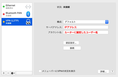 4.以下のように設定してVPN接続します。
