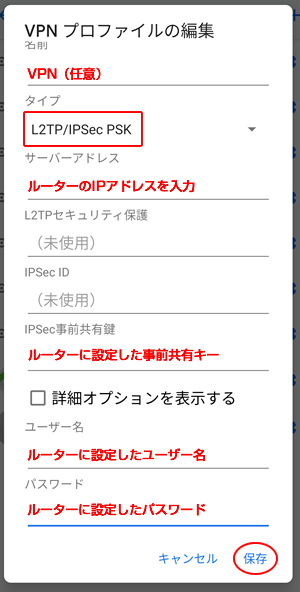 3.タイプを「L2TP/IPsec PSK」とし、以下のように設定してVPN接続してください。