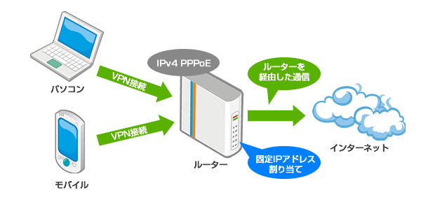 端末からルーターにVPN接続すると、ルーターに割り当てた固定IPアドレスでの通信になります。