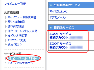 画面左側の「コントロールパネル」をクリックし、対象のサービスを選択します。 |