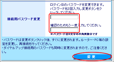 ご希望の新しいパスワード(8文字の半角英数字)を2回入力して、「変更」ボタンをクリックします。 |
