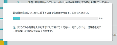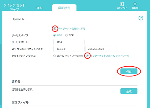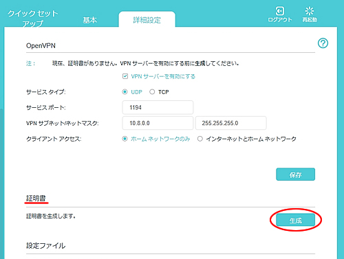2.OpenVPNの設定画面になりますので、証明書の「生成」をクリックします。