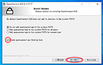 インストール時、「Create openconnect-gui Desktop Icon」にチェックを入れます。