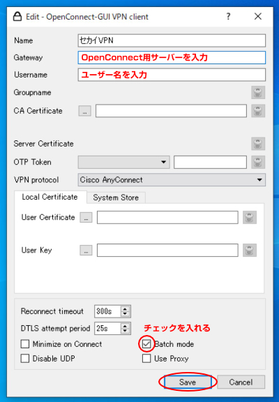 | Gatewayには、マイメニューで確認したOpenConnect用のVPNサーバーを入力してください。 |