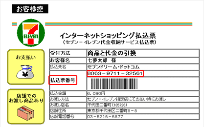 払込票番号をお控えいただいた場合は、「払込票番号」をセブンイレブン店頭でお伝えいただきお支払いください。