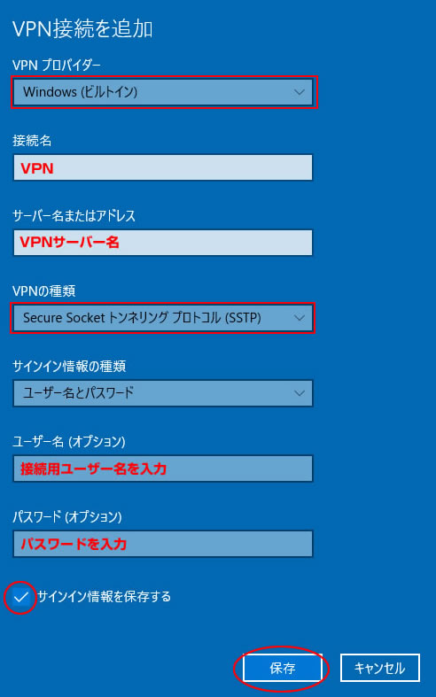 4.VPN接続を追加する画面になりますので、下記の通り入力し「保存」ボタンをクリックします。