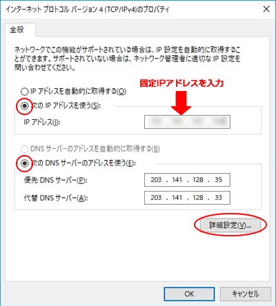 10.下記の画面が表示されます。固定IPアドレスとDNSサーバーは共に下記のように入力し、「詳細設定」をクリックします。